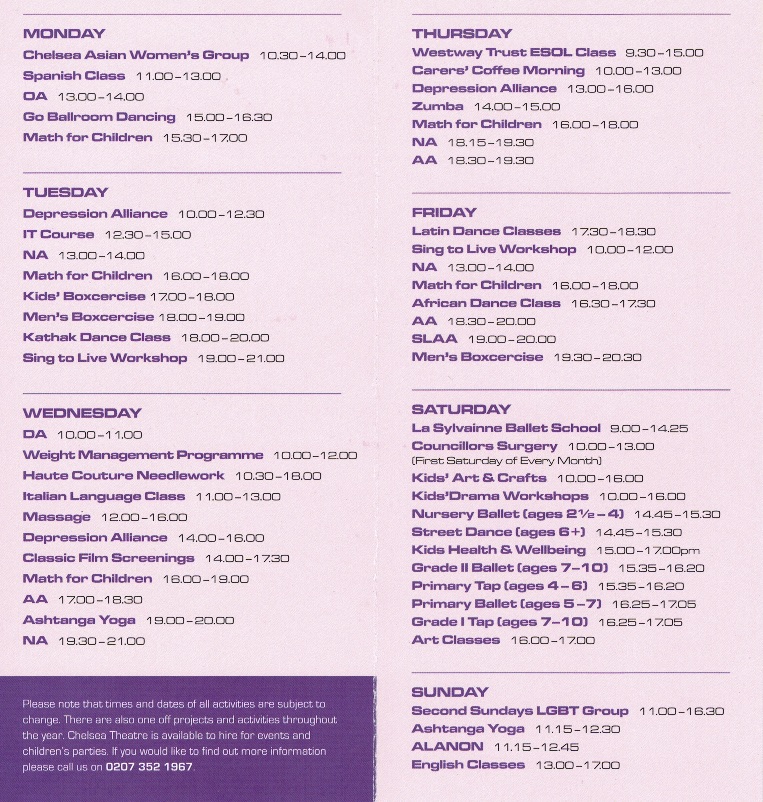 The Chelsea Theatre is offering a wide variety of courses, activities and events throughout the Summer designed to appeal to local residents on World's End, Cremorne and the wider area in West Chelsea. The Chelsea Theatre's regular events are listed below: